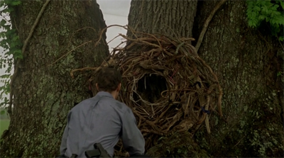 Il vortice di rami che incorniciano d’occulto la tana nell’albero.