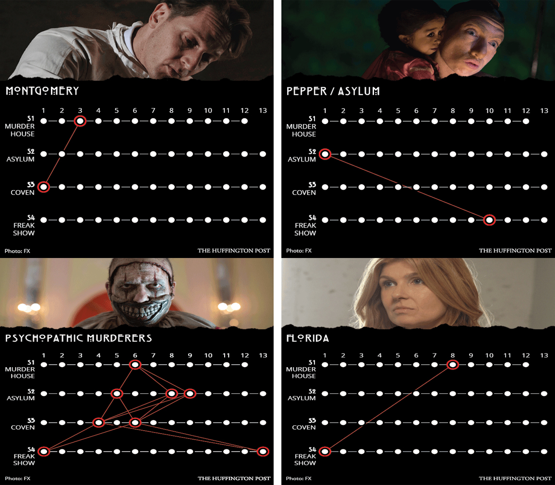 0- Ryan Murphy e il co-ideatore Brad Falchuk hanno annunciato che si sarà una quinta stagione, dopo aver rivelato che esse sono, tutte, collegate fra di loro: basta cogliere gli indizi seminati, stagione per stagione. Ecco, alcuni grafici dimostrativi per gli AHS-addicted…