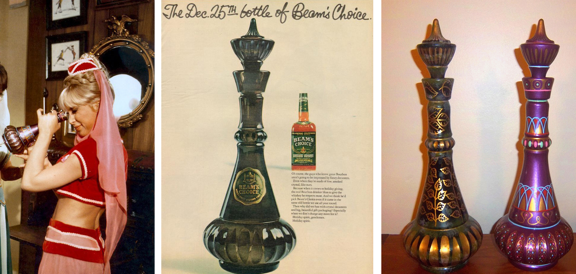 6 Publicato 13 settembre 2015 alle 2000 × 953 li Strega per amore, 10 curiosità sulla sitcom col genio più sexy di sempre ← Precedenti Successivi → La magica bottiglia color viola (l’originale verde fu pitturata con foglie in oro) era, in realtà, il contenitore natalizio e in edizione limitata del whiskey Bourbon “Beam’s Choice” del 1964, disegnata da Roy Kramer per la Wheaton Bottle Company.