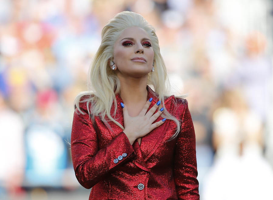 Lady Gaga places her hand over her heart after singing the U.S. National Anthem before the start of the NFL’s Super Bowl 50 football game between the Carolina Panthers and the Denver Broncos in Santa Clara