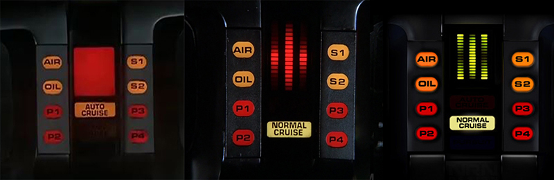7- L’evoluzione del cruscotto di K.I.T.T. : all’inizio della prima stagione, i momenti in cui l’auto parlava erano contrassegnati da un quadrato rosso lampeggiante. Seguirono le celebri linee da equalizzatore. Durante la terza stagione, K.I.T.T. fu distrutta e ricostruita come espediente narrativo per dare un restyling al cruscotto.