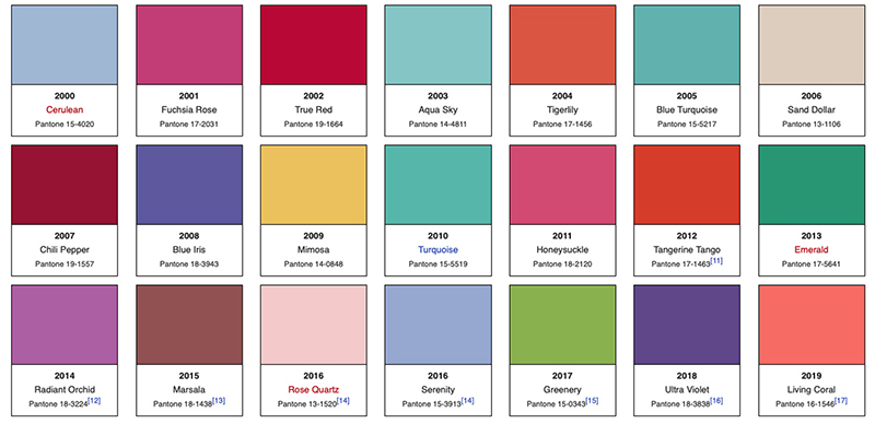 pantone-color-of-the-year-2000-2019 Publicato 6 gennaio 2019 alle 800 × 388 li Cos’è un colore Pantone? ← Precedenti