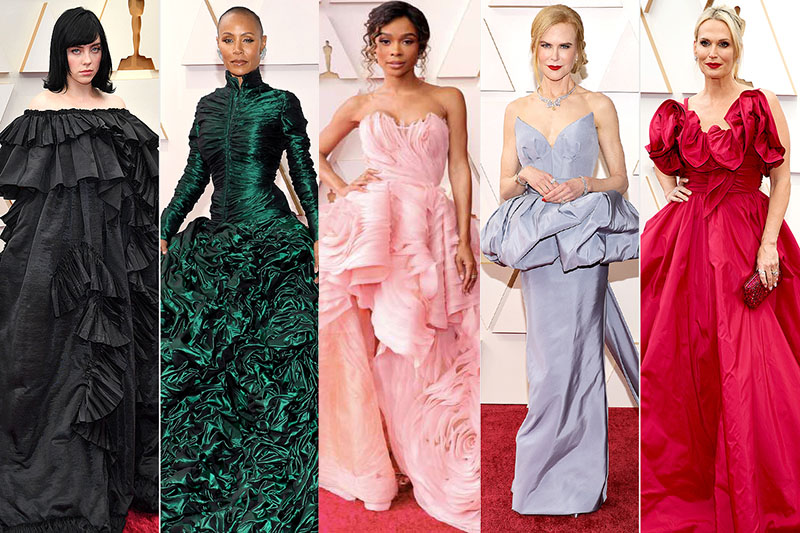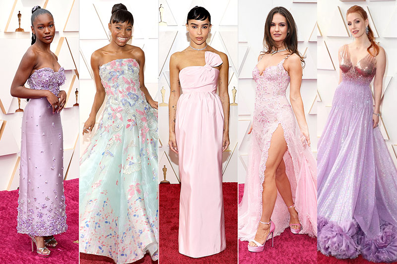 Una primavera dai colori pastello: Demi Singleton (in Miu Miu), Saniyya Sidney (in Armani Privé), Zoë Kravitz (in Saint Laurent), Lily James (in Atelier Versace) e Jessica Chastain (in Gucci).L’abito colonna: Maggie Gyllenhaal (in Schiaparelli), Naomi Scott (in Fendi Couture) e Becky G (in Etro).Balze e rouches come un principessa: Billie Eilish (in Gucci), Jada Pinkett Smith (Jean Paul Gaultier), Zuri Hall (in Sophie Couture), Nicole Kidman (in Armani Privé) e Molly Sims (in Elie Saab).
